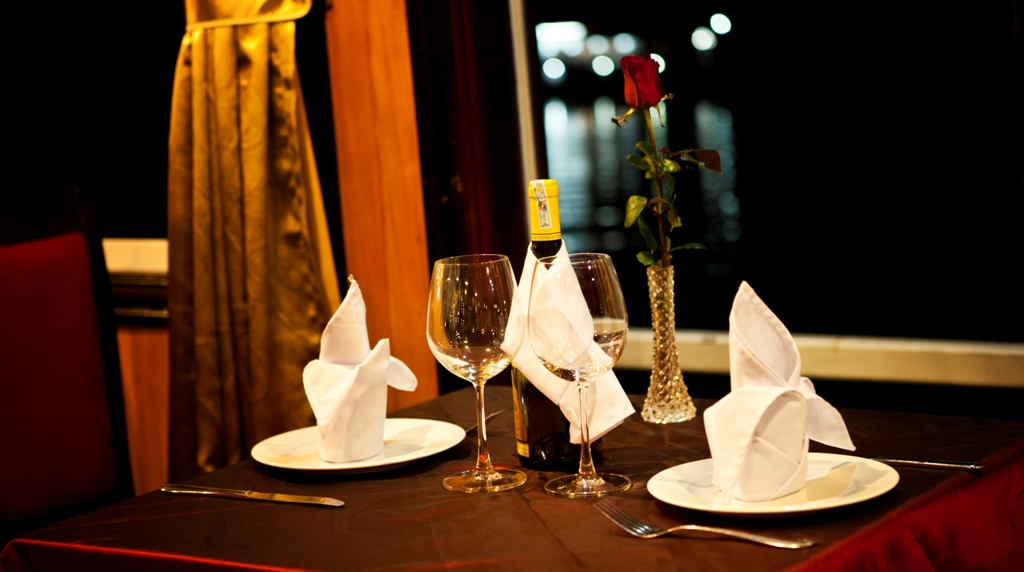 El restaurante de estilo de Oriente en la cubierta superior del V’Spirit ofrece un ambiente cómodo y ceñido. Este amplio espacio tiene capacidad para todos los visitantes del crucero, un lugar común para cenar y socializar. La increíble vista a través de los grandes ventanales sólo puede ser superada por la cena romántica en la cueva, tanto da el…